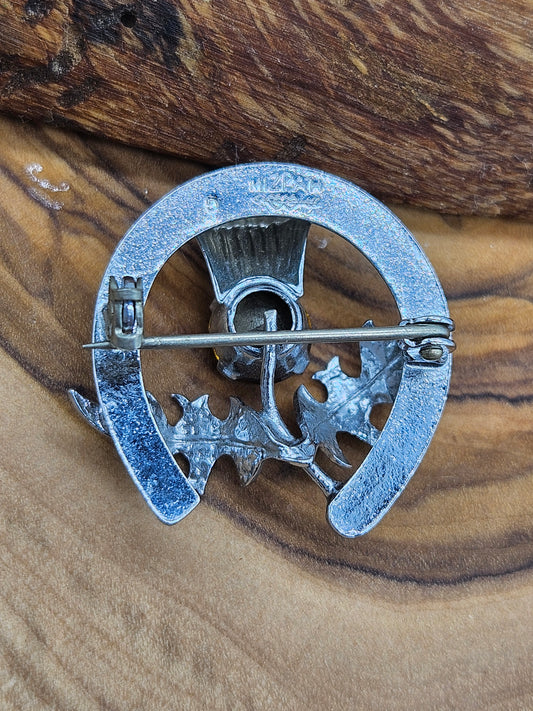 Vintage small Scottish Brooch Horseshoe and Thistle with yellow Gemstone