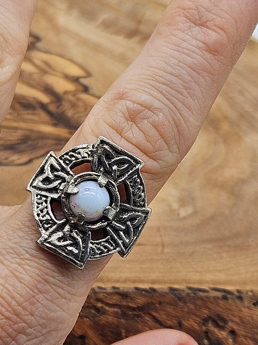 Vintage Celtic Cross Adjustable Ring with white Stone